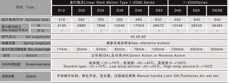 1-X250系列直行程氣動薄膜執行機構,采用單彈簧式結構,與1-X280系列相比,主要用于長行程控制,最大行程可達250mm,與氣動活塞式執行機構相比,具有調節精度高、重量輕等優點,也可用于切斷場合配以氣控閥、增速器、快速排放閥等可以實現快速切斷,快切時間最小可達1S。